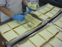 セサミトーストは、苦手とする児童が多いゴマを使用していますが、砂糖やマーガリンで甘く味付けをしているため、大人気でした。5名ほどで約700個を手作りしました。手作業で少し大変でしたが、おいしく仕上がり、好評でしたので嬉しかったです。たくさんの「おいしかった!」を聞くことができました。