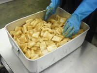 アスパラのチーズたまごやきは、チーズが入っていたことで食べやすく、まろやかな味に仕上がりました。3名ほどで約700食を手作りしました。大きな鉄板に卵を流し、オーブンで焼いた後、手作業で包丁で切ります。