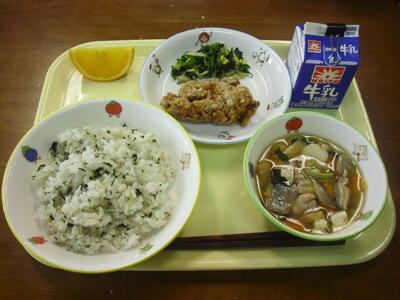 さつまいものかりかり天ぷらと、たこの天ぷらは、さつまいもはサクサクした食感で軽い口当たりでした。たこの天ぷらは、たこ焼きのように大きく食べ応えがありました。おいしそうに食べる児童がたくさんいました。