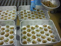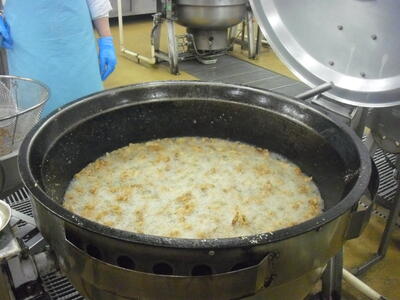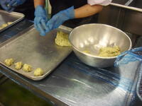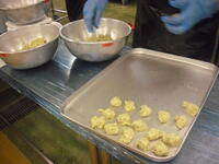 ポテトとかぼちゃのチーズ焼きは、4名ほどで約700個を手作りしました。具を炒めてから、大きなタライに移し、アルミのお皿に入れていきます。お芋のホクホク感と、チーズのうまみが合わさりおいしかったです。