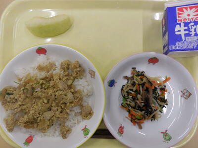 鶏の柳川風丼(麦ごはん) 磯香和え リンゴ 牛乳