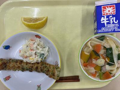 ほうとう ちくわの磯辺揚げ 豆入りポテトサラダ はるか 牛乳