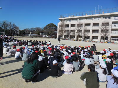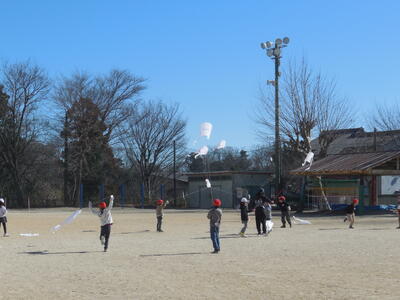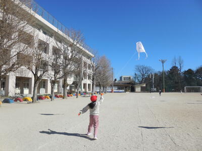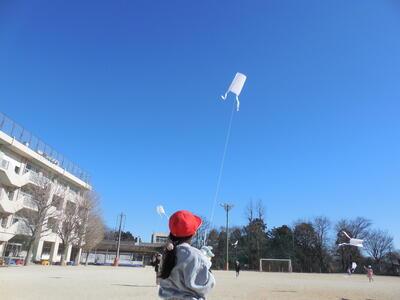 「最強の寒波襲来」と報道されています。今日の朝は冷え込みが厳しく、学校の池にも氷が張っていました。この寒波にも負けず、一年生は「たこ上げ」を楽しみました。♬たこたこ あがれ 風よく うけて 雲まで あがれ 天まで あがれ 雲までは上がりませんでしたが、青い空に白いたこが映えています!!