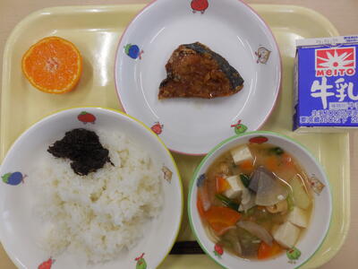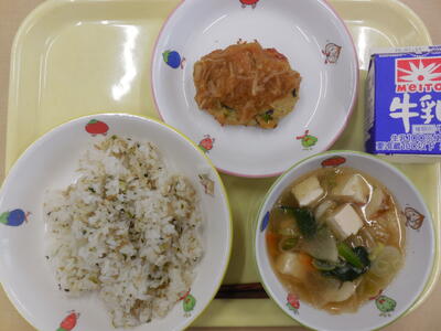 1月24日から30日は全国学校給食週間です。日本ではじめて学校給食が始まったのは、明治22年、山形県鶴岡町の忠愛小学校と言われています。 弁当を 持ってこられない子どもたちのために「おにぎり、塩鮭、つけもの」を出したのが始まりとされています。今日はそんな雰囲気で栄養のバランスを考えた献立です。