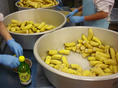 バナナは、とても新鮮なものが届きました。2名で半分に切り提供しました。切り口が変色しないように、レモン果汁をつけておきます。甘くておいしかったです。