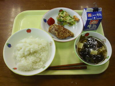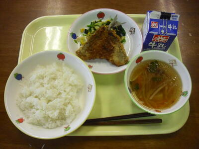 アジフライは、お魚のメニューの中では好んで食べる児童が多いです。「骨まで食べられておいしい!」「ソースがかかっているところは特においしい!」と言いながらほおばる様子が印象的でした。