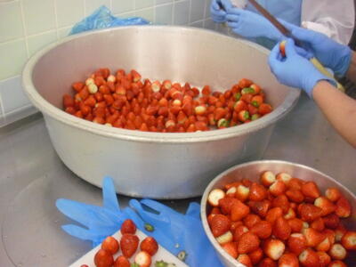 さくらんぼゼリーは、給食室で手作りしました。さくらんぼの軸を手作業でひとつずつ丁寧にとって食べやすくしました。ほどよい甘みで食べやすく、おいしかったです。