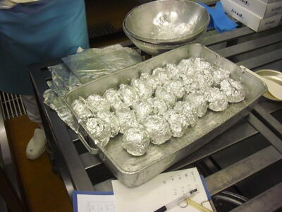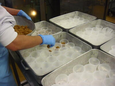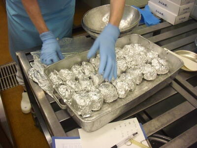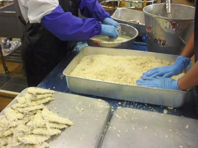 2人がかりで小麦粉・パン粉をつけて、1人で揚げます。計3名で作っていただきました。数は約680枚でした。衣は薄く、揚げ具合もちょうどよかったです。