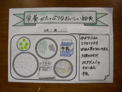 今日は、6年2組が家庭科の学習で献立作成に挑戦し、見事1位になった献立です。