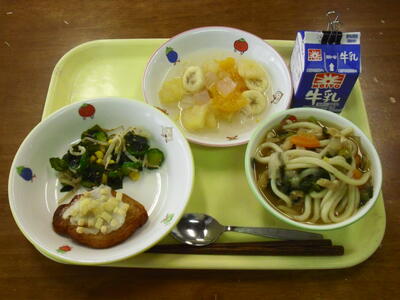 五目うどんは、野菜がたっぷり入っていて食べ応えがありました。おかわりをしている児童が多く見受けられてうれしかったです。
