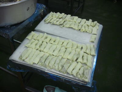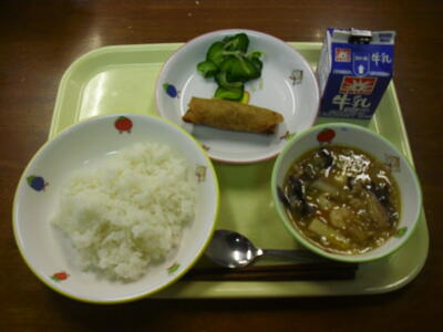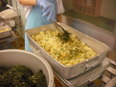 春巻きは、給食室で手作りしました。手包みで作業する方が4名、揚げる方が1名の計5名で作っていただきました。パリパリに仕上がり、中のポテトサラダもおいしく出来上がりました。