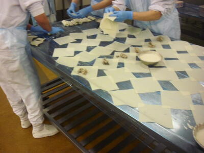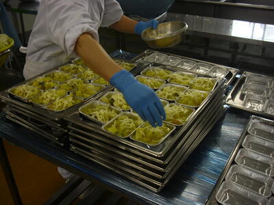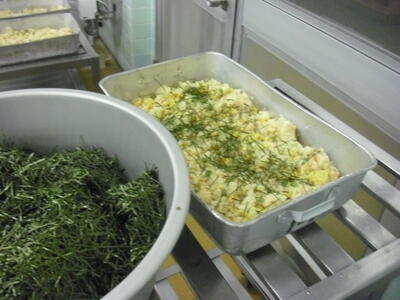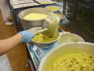 ポテトとかぼちゃのチーズ焼きは、5名ほどで680人分を手作りしました。全員に均等の量を乗せるために、アルミ皿にのせる具の量を計り、アルミ皿に乗せ、オーブンで焼きます。2種のお芋がホクホクでおいしかったです。
