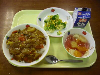 smile curry(スマイルカレー)は、6年生が外国語の学習でカレーの名前と材料を考えました。カレーのスパイスとチーズのコクが合わさっておいしかったです。