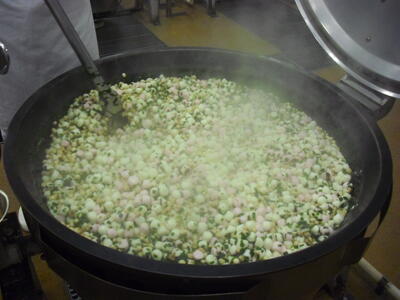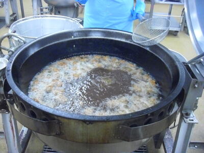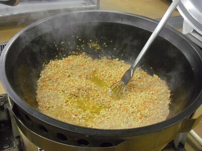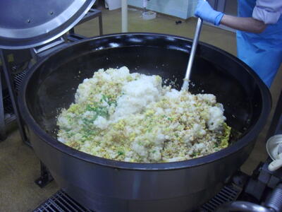 そぼろの具と炊き上がったご飯を釜で混ぜます。かなりの力仕事です!