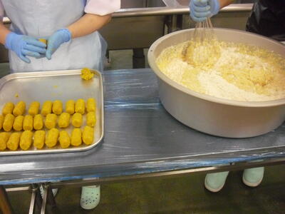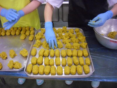 かぼちゃのクロケットは、5名で給食室で手作りしました。1つひとつ手作業で形を整えていきます。カラっと仕上がりおいしかったです。たくさんの児童から「おいしかった!」と感想を教えてくれました。