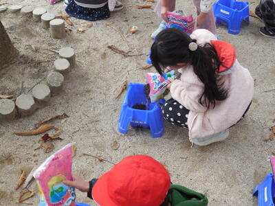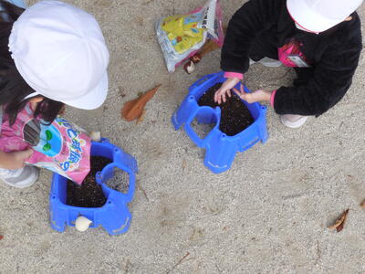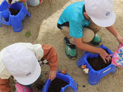 花ボランティア活動の隣では、1年生がチューリップの球根を植えています。土を入れ、球根のとがったほうを上にしてしっかりと植えていきます。しっかりお世話して、新入生を迎えてあげたいものですね。