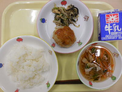 ごはん れんこんハンバーグ梨ソースがけ 磯香和え 沢煮椀 牛乳