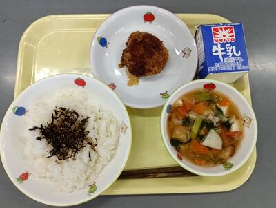 ごはん ひじきのふりかけ キャベツメンチ のっぺい汁 牛乳