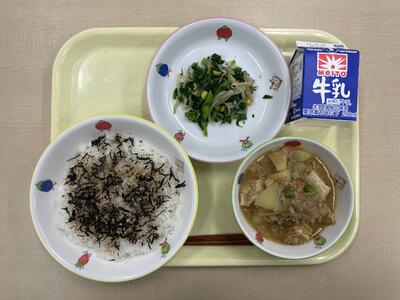 ご飯 手作りヒジキふりかけ 生揚げの肉味噌煮 菜の花の辛し和え 牛乳 です。