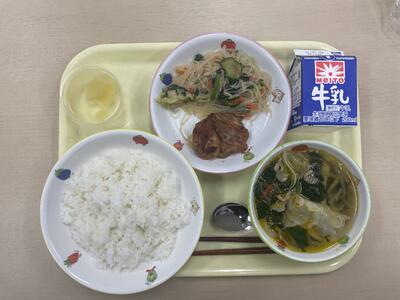 ご飯 鶏の照り焼き 春雨サラダ ワンタンスープ 手作りパインサラダ 牛乳 です。