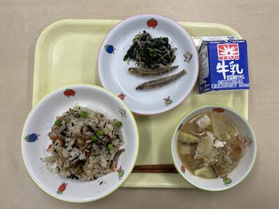 ひじきご飯 きびなごのガーリック揚げ さつま汁 ほうれん草の梅磯和え 牛乳 です。