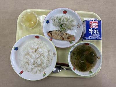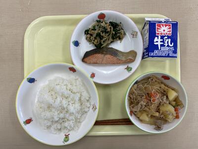 ご飯 鮭の幽庵焼き ほうれん草の納豆和え 肉じゃが 牛乳 です。