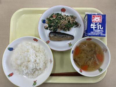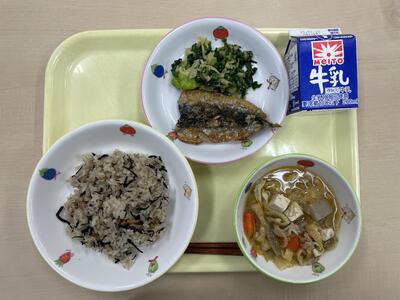 節分ご飯 鰯のかば焼き ほうれん草の胡麻和え 豚汁 牛乳 です。