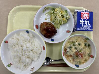 ご飯 野菜ハンバーグ ブロッコリーサラダ トマトと卵のスープ 牛乳 です。