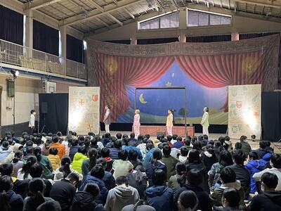 改修工事の終えた体育館に2学年ずつ、午前午後と分かれ、3回公演で行いました。