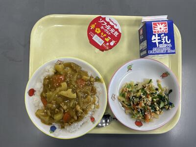 なかよしカレーライス ピリ辛五色和え ヨーグルト 牛乳 です。