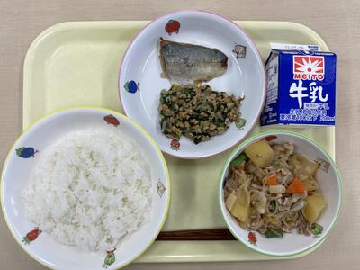 ごはん アジのピリッと焼き 納豆和え 肉じゃが 牛乳 です。