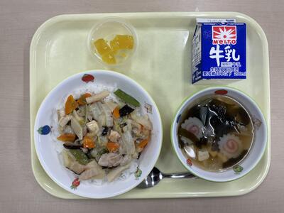 中華丼 わかめスープ ピーチゼリー 牛乳 です。