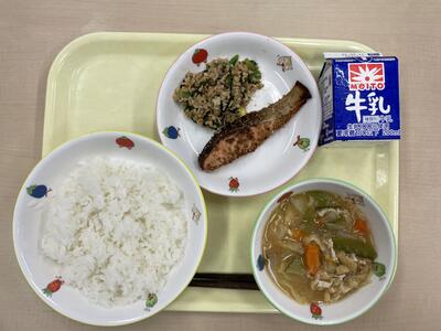 ごはん 鮭の南部焼 スタミナ納豆 ジャガイモの味噌汁 牛乳 です。