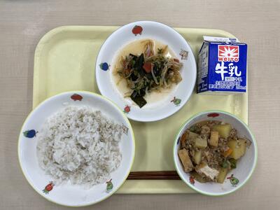 麦入りご飯 生揚げのジャージャー味噌煮込み シラス入り中華和え 牛乳 です。
