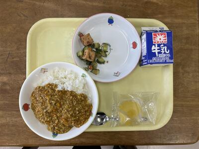 キーマカレー 生揚げのコロコロサラダ フローズンアップル 牛乳 です。