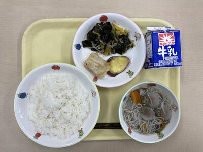 ごはん イカの天ぷら サツマイモの天ぷら 梅香和え 七夕そうめん汁 牛乳 です。