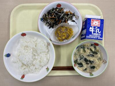 ごはん ひまわりシュウマイ ひじきとチーズのマリネ 卵スープ 牛乳 です。