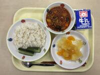 玄米ご飯 チリコンカン フレンチキュウリ 梅ゼリーのフルーツ和え 牛乳 です。