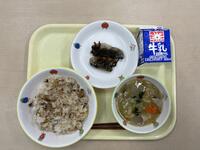 かつおめし イワシの黒ゴママリネ 豚汁 牛乳 です。