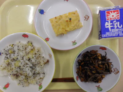 サツマイモごはん 高野豆腐入りオムレツ ひじきの炒め煮 牛乳