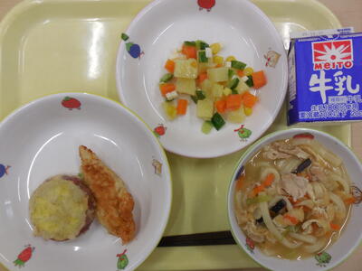 山菜うどん 天ぷら(鶏・サツマイモ) マセドアンサラダ 牛乳