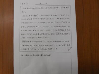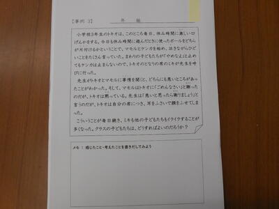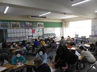 を行います。事例は、学校内で起こりうる人間関係のトラブルについてが例示されているので、子どもたちも自分の身に引き寄せて考えることができ、いろいろな考えを発言します。地域の方が、グループでの話し合いの進行役を務め、子どもたちの意見を受容的・共感的に聴いていきます。温かい雰囲気の中で自由に発言し、異なる意見を認め合ったり、お互いを大切にする気持ちを育んだりする態度を養うことを目指しています。たくさんの方々にご協力いただき、3年生はいろいろな考えを持つことができました。ありがとうございました。
