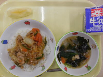 ホイコーロー丼(麦ごはん) わかめスープ リンゴ 牛乳