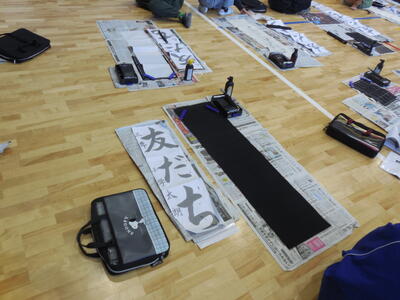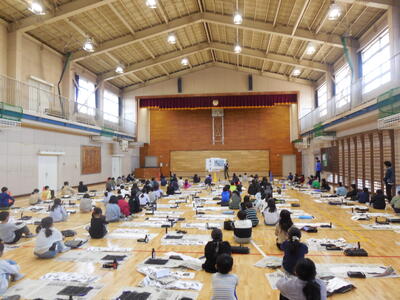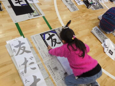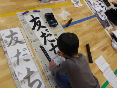 今日は、3年生が体育館で書初めを行いました。これまでの練習の成果を発揮して、のびのびとした文字を書くことができました。作品は、台紙に貼り、教室前の廊下に掲示します。30日の学習参観の際にご覧ください。