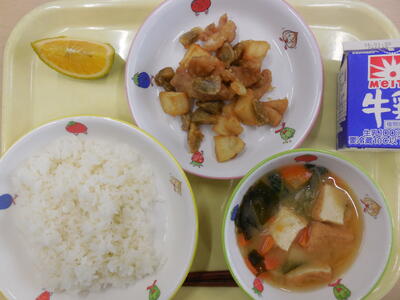 ごはん チキチキごぼう 里芋のみそ汁 スイートスプリング 牛乳