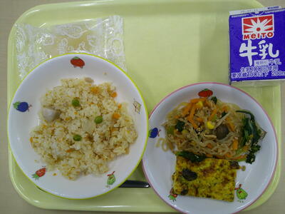 ツナピラフ きのこのオムレツ しらたきソテー 冷凍洋ナシ 牛乳