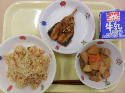 大豆入り五目ご飯 イワシの竜田揚げ 大根と豚肉の煮物 牛乳