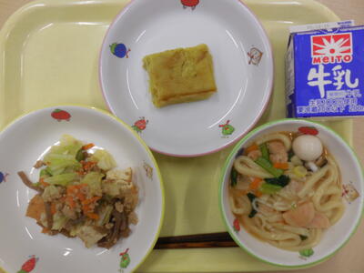 あんかけうどん 豆腐のオイスターソース炒め スイートポテト 牛乳