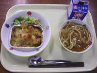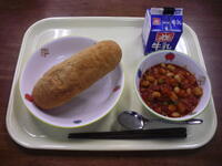 当日は、就学時健康診断でした。それに伴い、給食時間がいつもより50分早く、また、下校時間も早かったため、簡単に配膳ができるメニューでした。外はカリッと、中はふわっとしたあげパンが大好評でした。