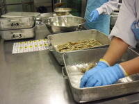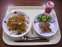いわしのかば焼きは、カラっと揚がって美味しかったです。下の写真は、揚げ終わったいわしを各クラスの食缶に入れる作業をしています。いわしは他の魚と比べると骨が多く苦手な人が多いですが、残菜は少なかったです。